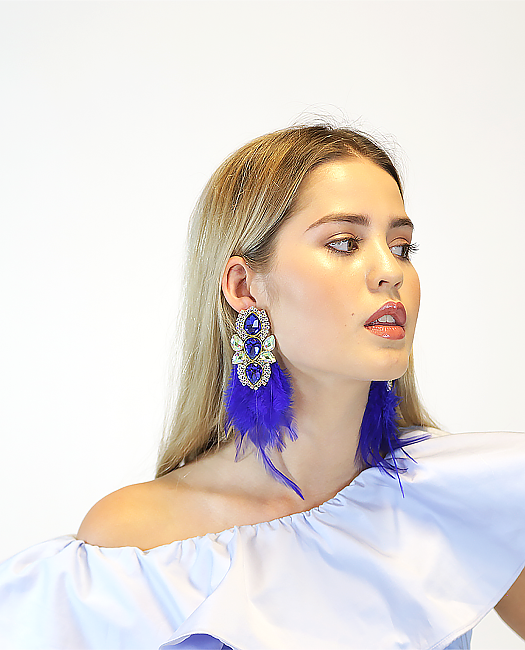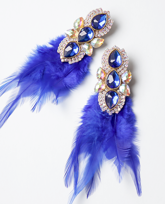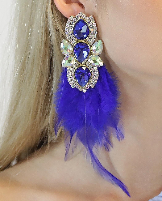 Oorbellen moeten opvallen! De opvallende blauwe veertjes en de schitterende grote stenen geven deze oorbel een glamour look. Ga jij voor blauw dan is dit de oorbel voor jou.